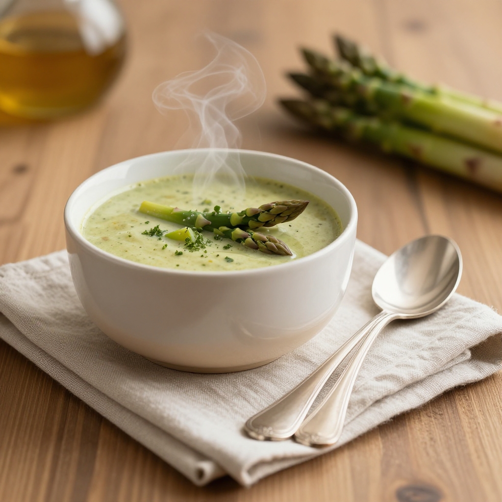 A steaming bowl of creamy asparagus soup garnished with fresh asparagus spears and chopped herbs, placed on a folded linen napkin. The setting includes a pair of silver spoons on a wooden table with a soft-focus background featuring additional fresh asparagus and warm earthy tones, creating a cozy and inviting atmosphere.