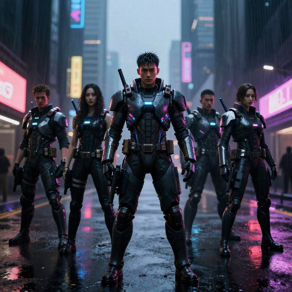 Man in Futuristic Armored Suit with Neon City Background