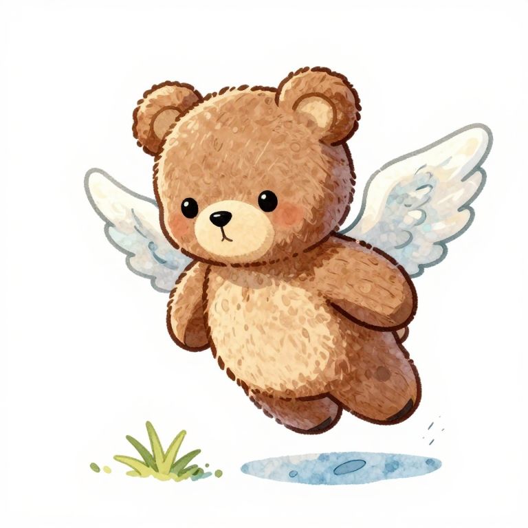 This is a digital illustration of a cute, fluffy brown teddy bear with a cream-colored belly and small black eyes. The teddy bear has white, semi-transparent wings and is depicted mid-flight, with a small shadow below. The bear's fur is textured with soft, wavy lines, giving it a plush appearance. The background is plain white, highlighting the bear. A small patch of green grass and a blue puddle are visible at the bottom left, adding a touch of scenery. The overall style is whimsical and child-friendly, with bright, cheerful colors and a playful, innocent vibe.