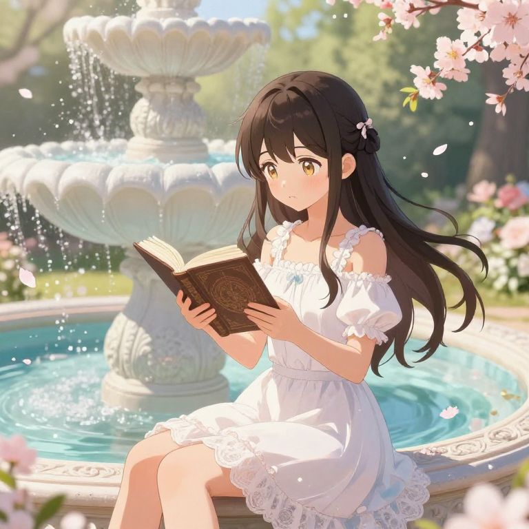 Full-Frame beautiful young anime girl sitting in a fairy fountain reading a book of incantations, while her wishes and dreams float like flower blossoms around her, 16k,