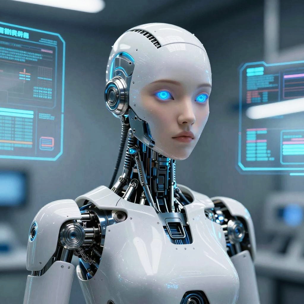 Futuristic AI android with a flawless buzz cut, intricate mechanical joints and glowing blue eyes, surrounded by holographic interfaces and data grids, ultra-realistic style, high-resolution, neon colors, set inside a high-tech laboratory with sleek metallic surfaces