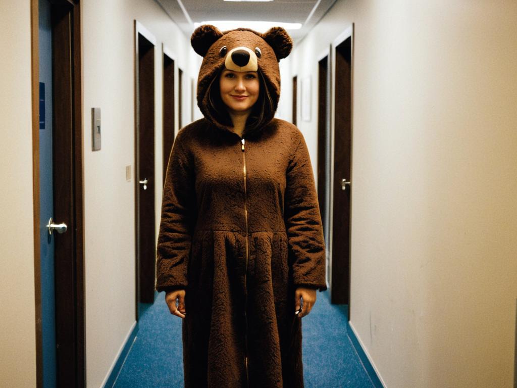 Photograph of a young woman standing in a brightly lit, narrow hallway with blue carpet and white walls. She wears a brown, fuzzy bear costume with a hood featuring bear ears and a black nose. The costume has a zipper down the front and a matching skirt. Her facial expression is neutral, and she stands centrally in the image, facing the camera. The hallway has dark wooden doors on either side, and the lighting creates a strong contrast between the brightly lit hallway and the darker costume.