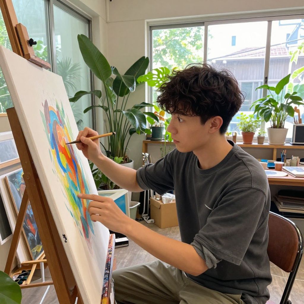 Young Asian man with curly black hair, wearing a dark gray shirt, painting on an easel in a sunlit, plant-filled studio.