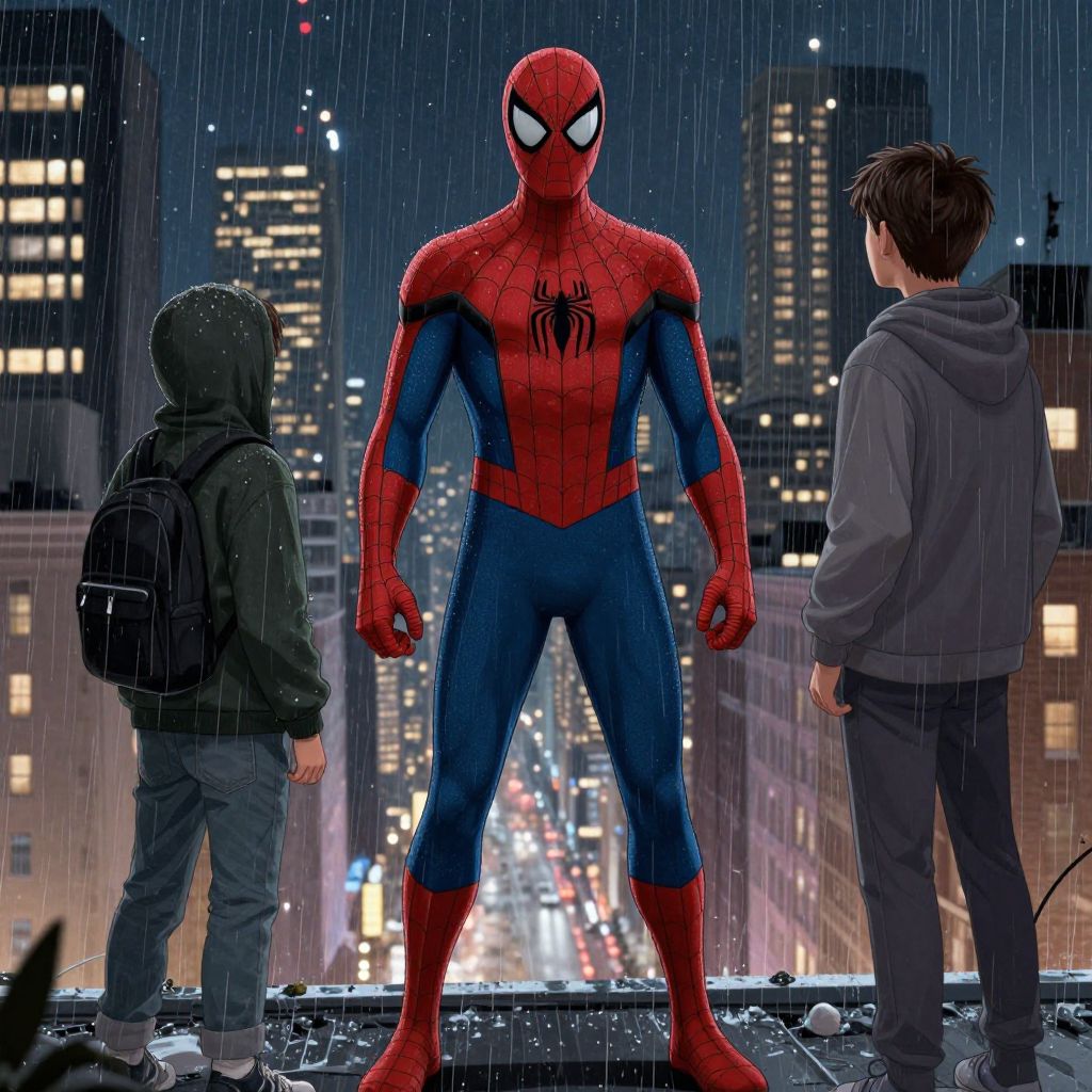 A detailed illustration of Spider-Man in his iconic suit, standing in a cityscape at night, with a young man in a hoodie looking out into the rain.