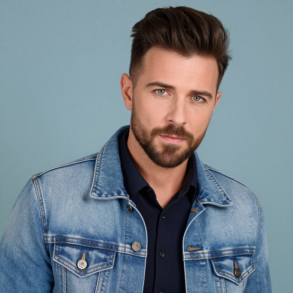 A stylish man poses in a close-up headshot wearing a trendy denim jacket over a dark shirt, showcasing a contemporary casual look. His well-groomed hair and beard complement the modern and clean aesthetic against a soft teal background.