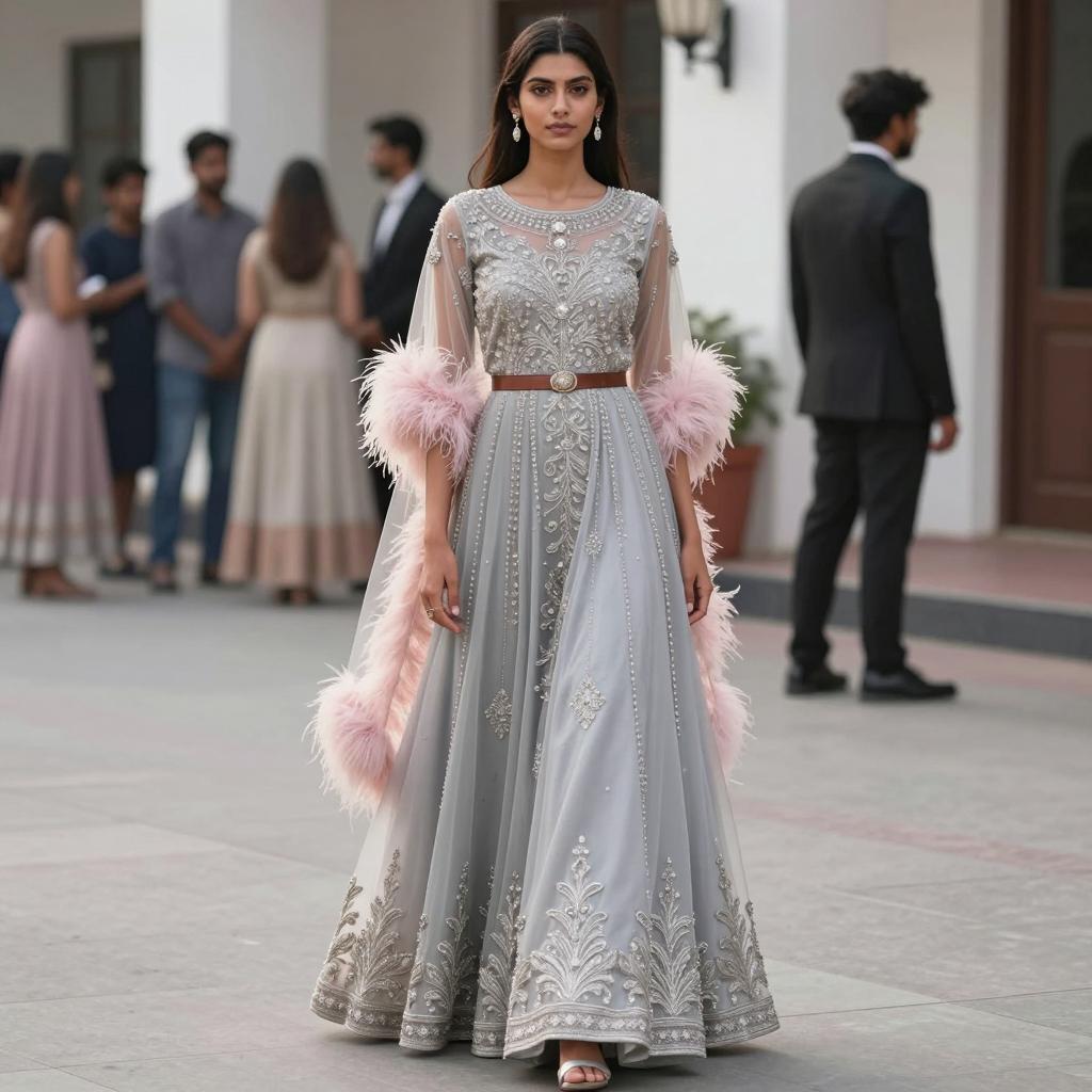 Woman formal evening gowns, photorealistic, full body shot, young woman, standing, outdoor, daytime, Indian-inspired fashion, long flowing silver gown, intricate silver embroidery, sheer pink feather-like sleeves, high neckline, brown belt, silver sandals, straight brown hair, long hair, side part, serious expression, background blur, people in background, man in black suit, people standing, white building, concrete sidewalk, soft natural light, fashion photography style, realistic ures, detailed fabric, elegant and regal attire, fashionable and traditional elements, Indian cultural influence