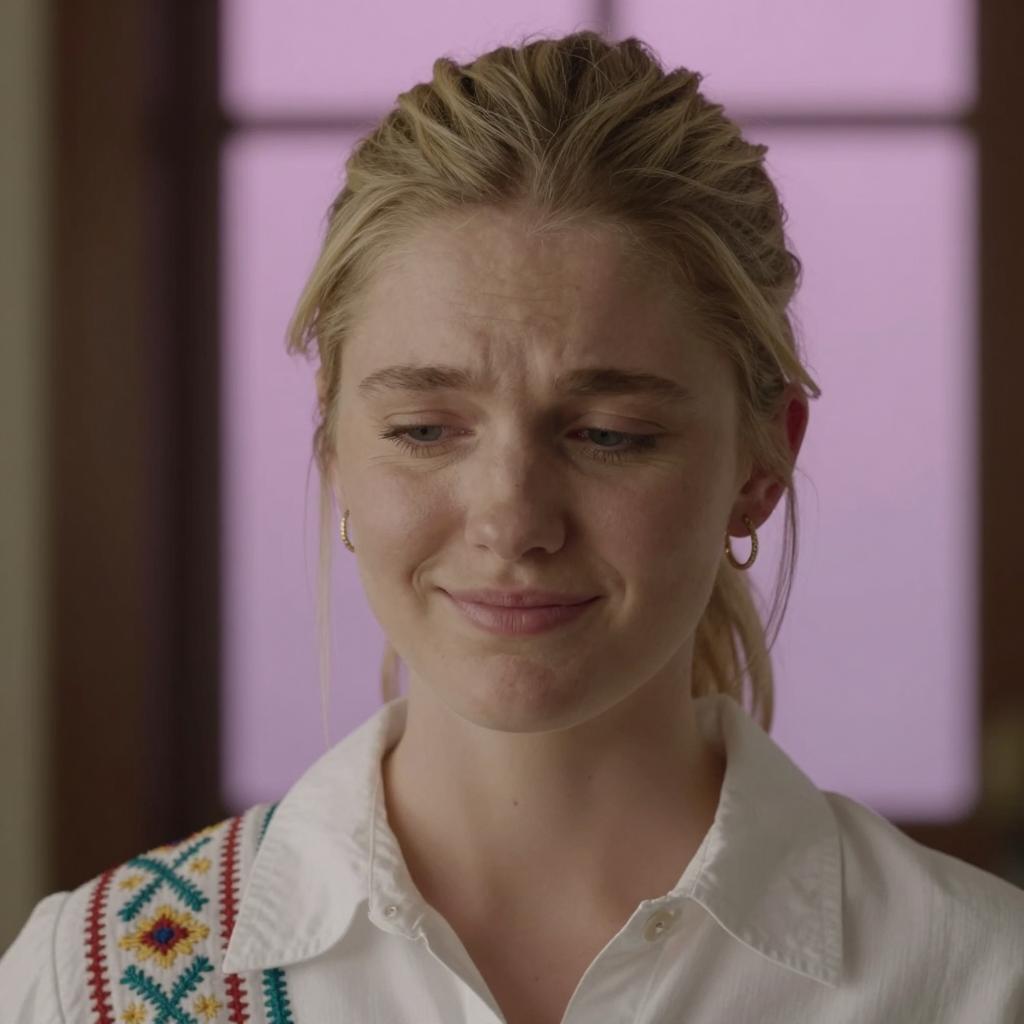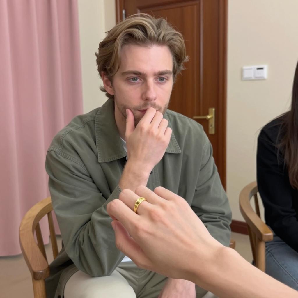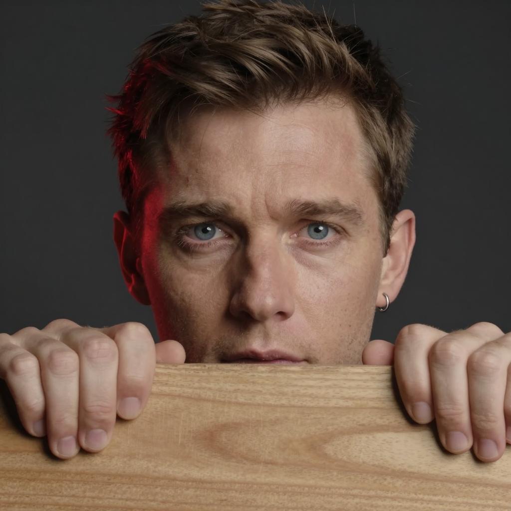 A man with short blonde hair, pale skin, and a slightly open mouth, rubbing his temple with his right hand. He wears a dark shirt over a white collar. Red lighting casts a warm hue over the scene. His face shows slight discomfort. Background is blurred, suggesting an indoor or nighttime setting.