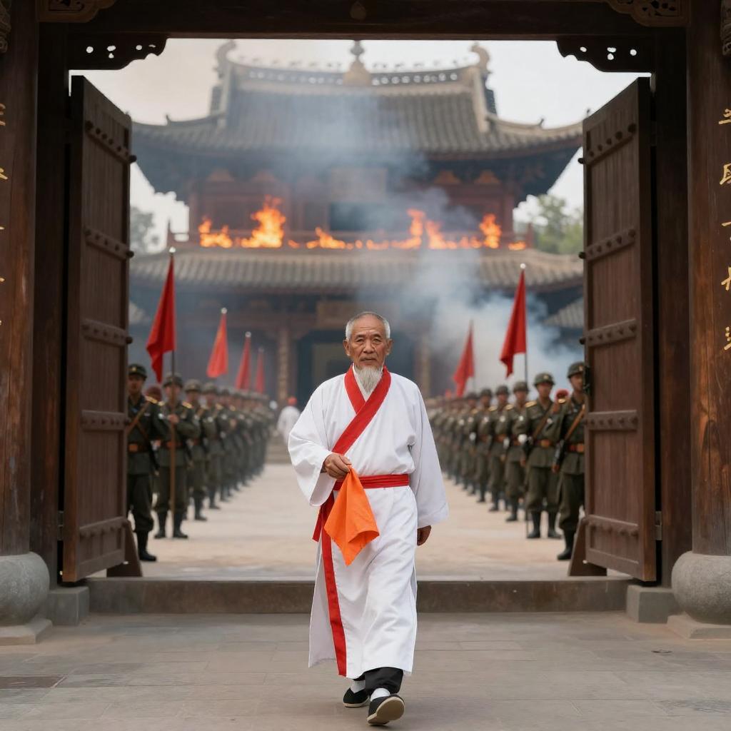 Photograph of an elderly Buddhist monk in white and orange robes, barefoot, walking through a burning temple gate. Soldiers in red and black uniforms with spears stand in the background. Flames and smoke engulf the temple roof. Monk's calm expression contrasts with soldiers' tense stances. Temple gates frame the scene.