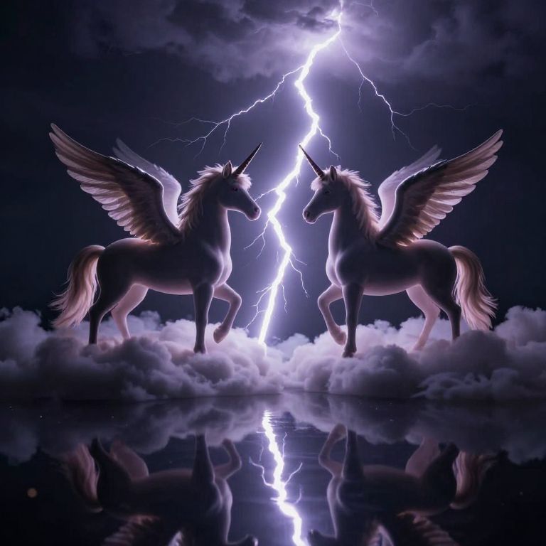 Two winged unicorns stand poised on a cloud bridge, their silhouettes illuminated by a striking bolt of lightning that arcs between them, casting dramatic reflections in the mirrored surface below.