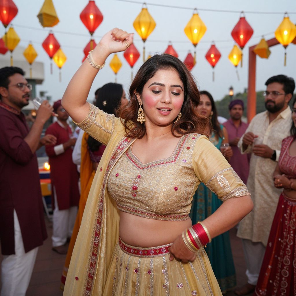 A festive woman in a festive lehenga aur kurti, with fair skin, rosy cheeks, and sparkling eyes, dancing with friends in a crowded wedding celebration at a rooftop in Hyderabad, the setting filled with red and yellow lanterns, music, and clinking glasses.. The woman has big tits and cute face