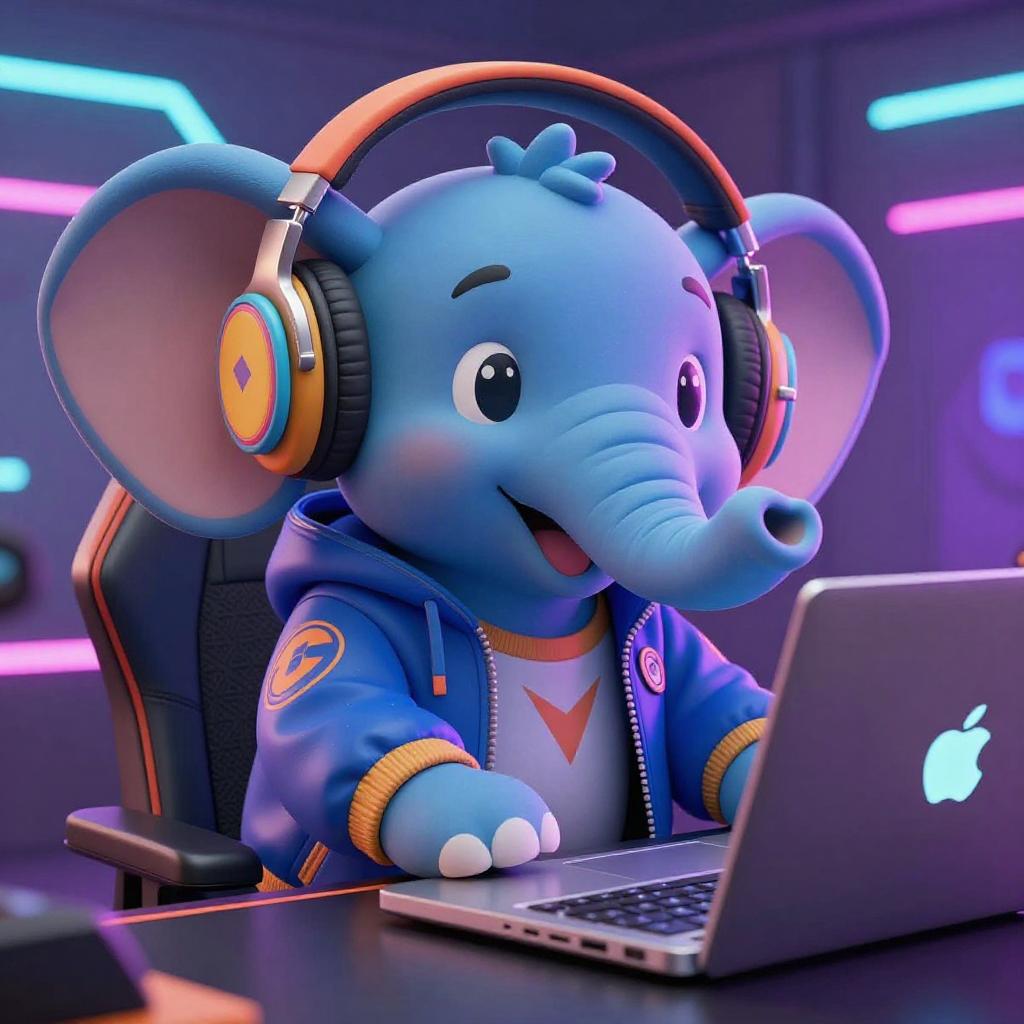 Digital artwork of a vibrant, playful blue elephant character wearing colorful headphones and a detailed jacket, intensely gaming on a laptop. The elephant is depicted as an esports player with a cheerful expression, set against a neon-lit background with dynamic lines. The design features influences from contemporary digital artists and is rendered in high detail with vivid colors and cinematic lighting effects.