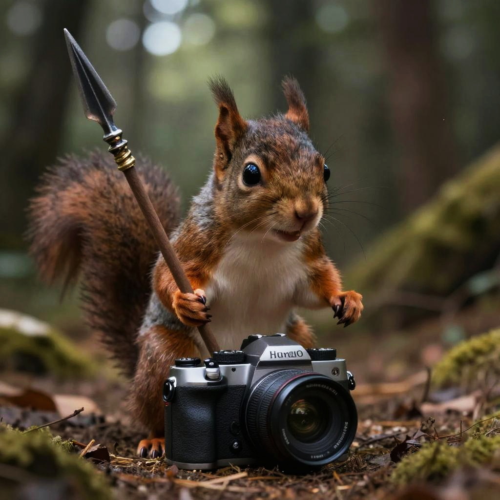 Illustration of a little magical cute forest creature. The creature IS holding a spear. fantasy art, intricate details, style Jean - Baptiste Monge, style Alan Lee, anthropomorphic squirrel, scene from a movie, dramatic shot angle, atmospheric particles, Real, raw cinematic photorealism, action portrait, 8k, detailed, centered