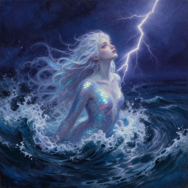Craft an image reminiscent of Gustave Doré's detailed illustrations, portraying a luminous mermaid emerging from tumultuous waters towards an enigmatic island obscured by haze. View the scene from a bird's eye view above the undulating waves, capturing her scales glistening under lunar light as she traverses through the lively currents and bathed in gentle, amber rays filtering through the dense fog. The composition should convey a sense of awe and bewitchment while subtly suggesting the concealed mysteries awaiting on the mist-enveloped island, fostering an ambiance brimming with both fascination and apprehension.