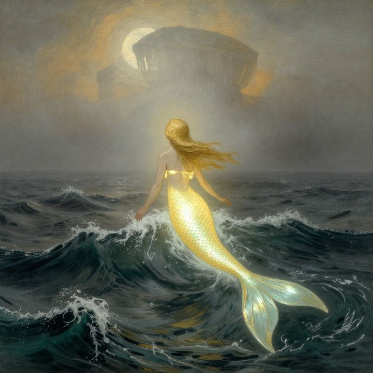 Digital painting of a glowing yellow mermaid with long blonde hair, swimming towards a mysterious, mist-covered island under a dim moon.