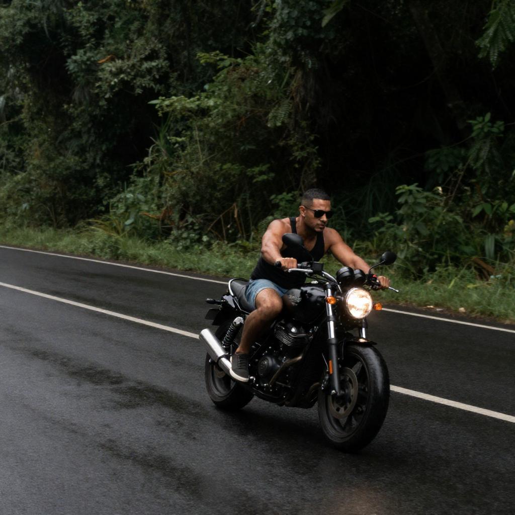 Photograph of a muscular man with dark skin and short hair, wearing a black tank top and sunglasses, riding a black motorcycle on a curved, wet road. Dense, dark green foliage lines the background. The road's surface is slick, reflecting light. The man is positioned slightly to the right, leaning forward, with the motorcycle's front wheel leading.
