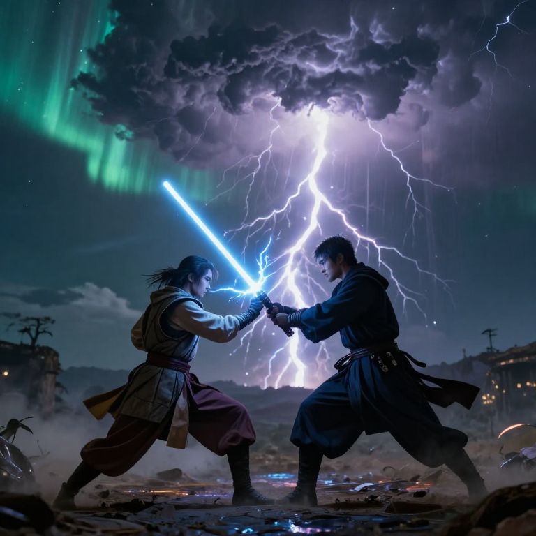 A jedi knight duels a sentient thunderstorm using a lightning-harnessing lightsaber in a sky battlefield of storms and auroras.
