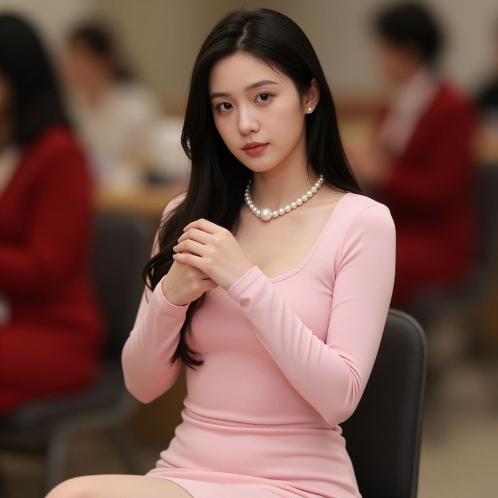 Photograph of an attractive East Asian woman with long black hair, wearing a form-fitting, light pink long-sleeve dress and a pearl necklace. She sits on a black chair in a blurred classroom setting, with other students in red blazers visible in the background. Her hands are clasped together near her chest, and she gazes directly at the camera with a slight, serene smile. The background is out of focus, emphasizing her as the central subject. The lighting is soft, highlighting her fair skin and delicate features.
