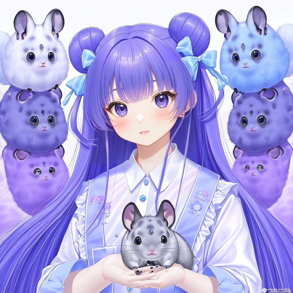 Amamiya shizuku (hizuki yayoi), original, 1girl, hair between eyes, blue eyes, purple eyes, purple hair, very long hair, blue hair, two side up, double bun, hair bow, medium breasts, collarbone, white shirt, blue bow, chinchilla (animal), animal, by artist chowbie, anime