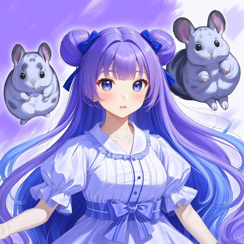 Digital anime-style portrait of a girl with very long purple hair styled in double buns with white hair ribbons. She has large purple and blue eyes, a white shirt with ruffled sleeves and a large blue bow at the collar. The girl is holding a small chinchilla with black and white fur. The background is decorated with purple rose designs, creating a soft, pastel aesthetic.