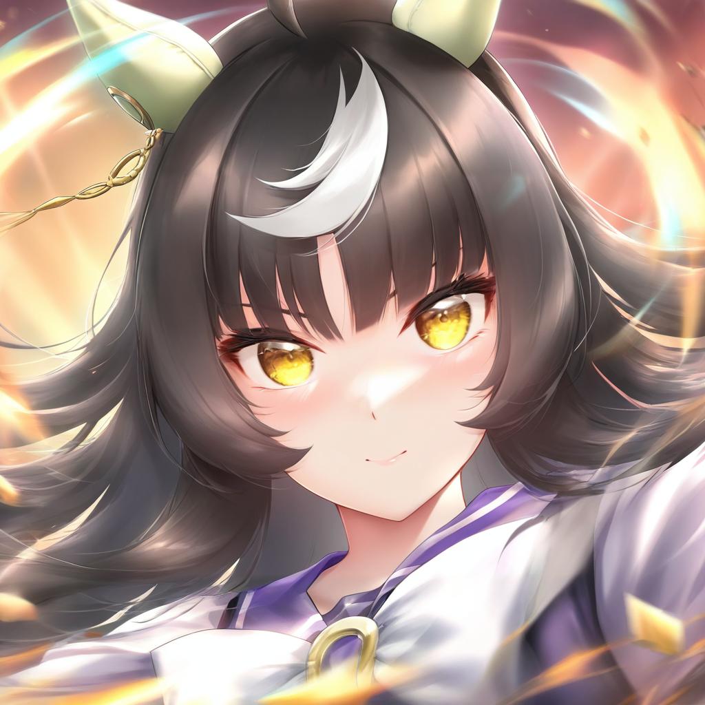 Calstone light o (umamusume), umamusume, 1girl, horse girl, horse ears, horse tail, ear covers, yellow eyes, black hair, long hair, white hair, ahoge, blunt bangs, hime cut, by artist rei kun, leet
