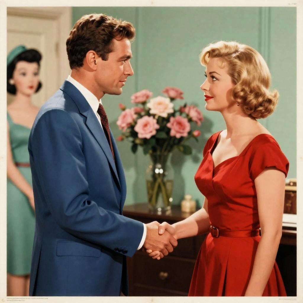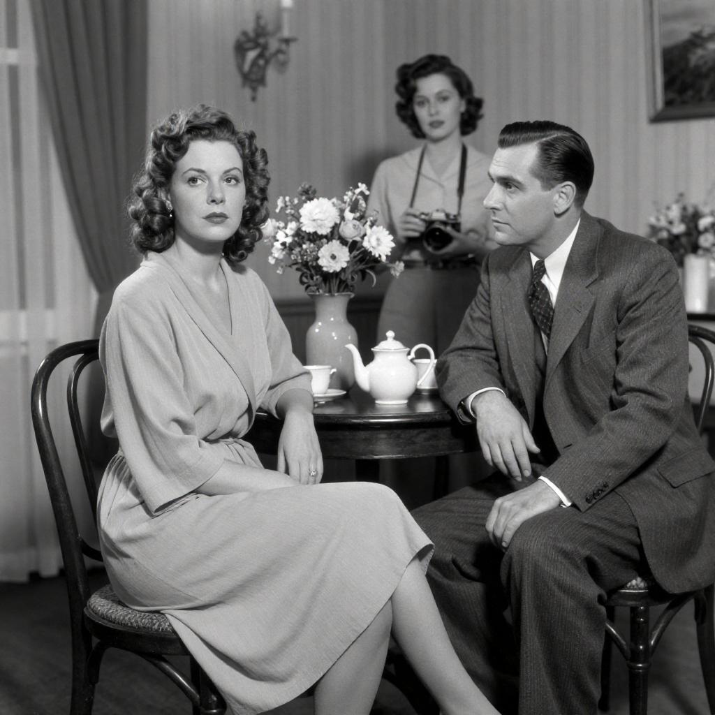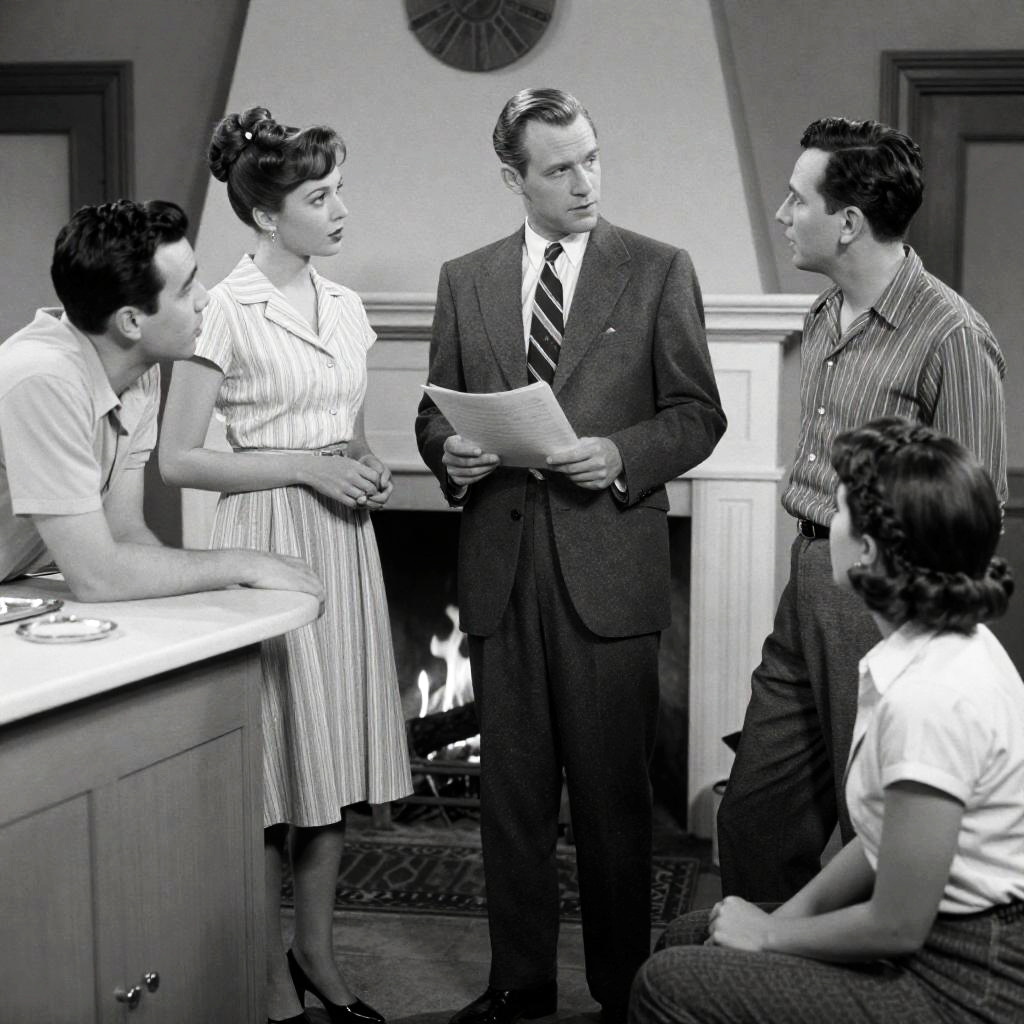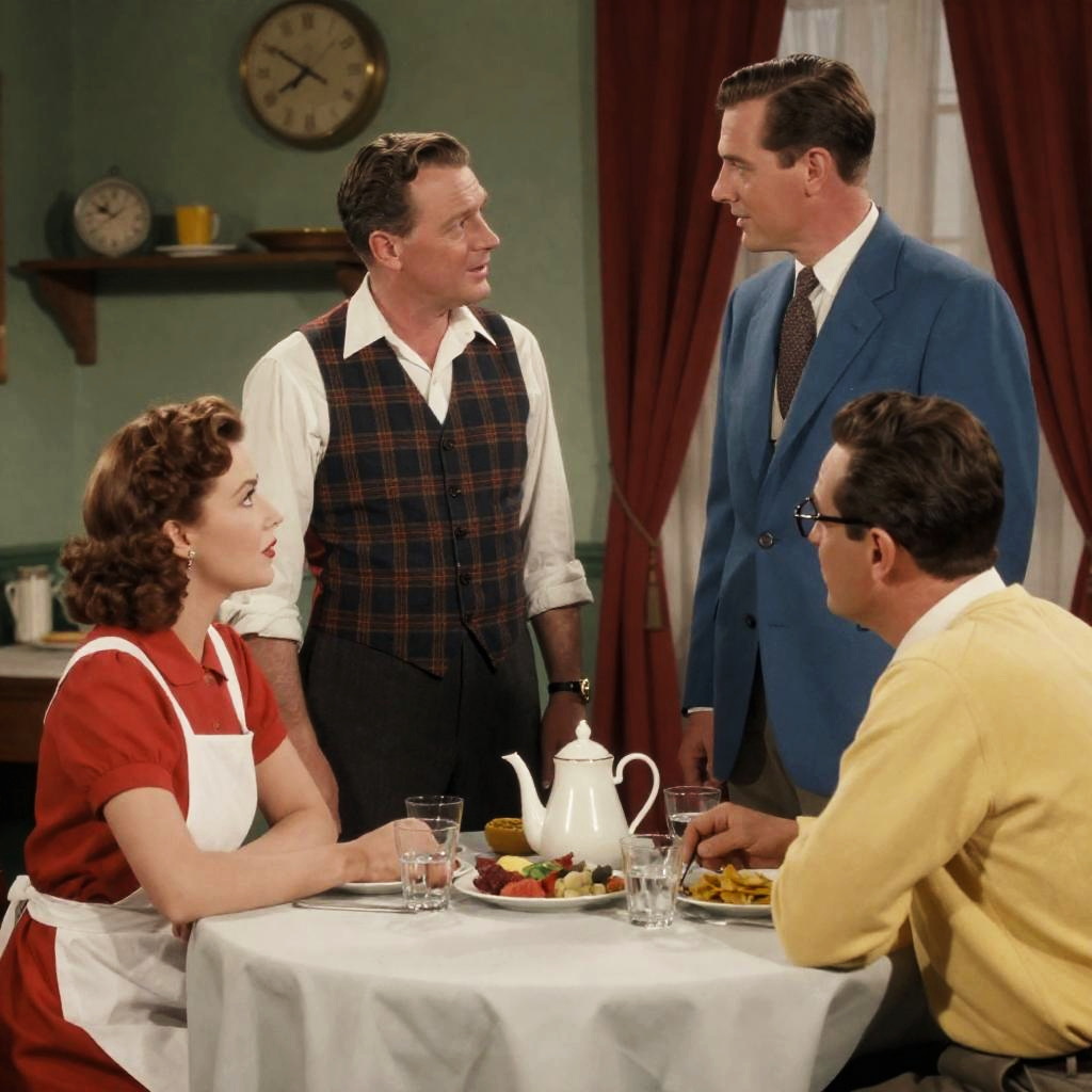 Vintage movie still with four people in a dining room. Three men and one woman, 1940s attire. Man in plaid vest and white shirt stands, talking to man in blue suit. Woman in red dress and white apron sits. Another man in glasses and yellow sweater sits at table. Table has food, teapot, and glasses. Green walls, red curtains, clock on wall. Woman looks at man in blue suit, others engaged in conversation.