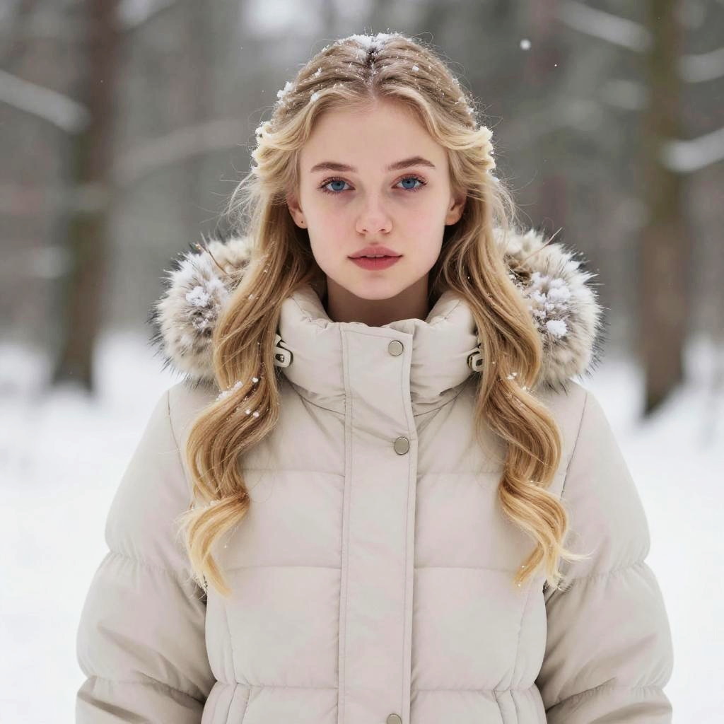 (Russian), (photorealistic:1.4), 1girl, (sharp chin:2), (snow background, snowing, forest) (Flap Pocket Fuzzy Trim Hooded Puffer Coat, fully clothed, very thick winter jacket, thick jacket with fur hoody:1.3), solo focus, upper body, looking at viewer, close up, (blonde hair, twintail hairstyle), blue eyes, (wavy hair), sfw, detailed background, bokeh, (best quality, ultra high res, raw photo, masterpiece, extremely detailed photograph)
