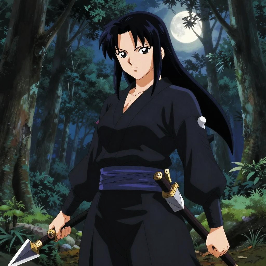 Realistic photo.a skilled kunoichi, wearing a stealthy black ninja outfit, wielding a pair of shuriken, standing in a moonlit forest, illustrated in the action-packed and historical anime style of Nobuhiro Watsuki. realistic photo