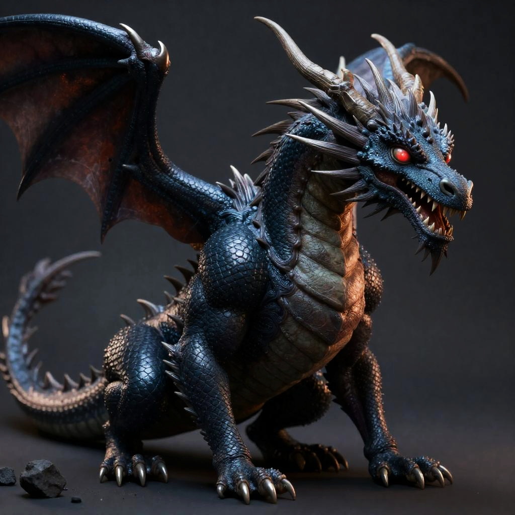 Photorealistic CGI of a fierce, dark blue dragon with glowing red eyes, sharp claws, and spiked scales, standing on a dark background with a