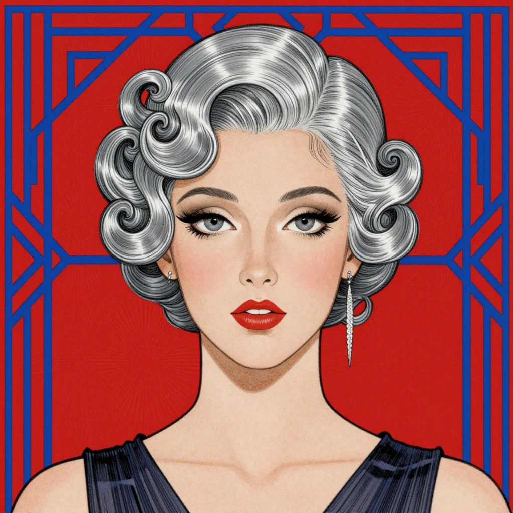A striking Art Déco-style illustration by Catherine Abel, featuring a woman with elegant silver hair styled in intricate curls, set against a vibrant red background adorned with blue geometric patterns, showcasing the artist's mastery in capturing vintage glamour through detailed digital art.