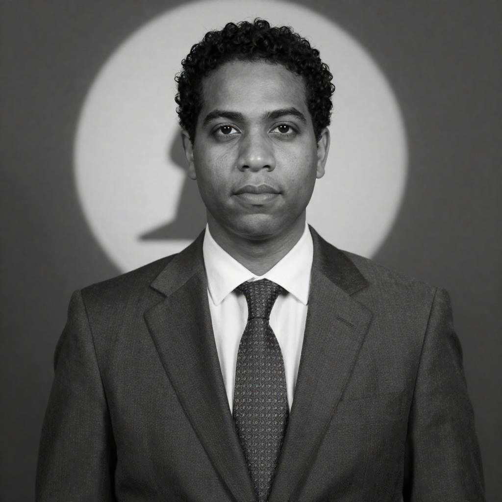 Black and white photograph of a man with short, dark curly hair, wearing a ured suit jacket, patterned tie, and collared shirt. He stands against a blurred background with a large circular object behind him. His expression is neutral. The man is centered in the frame.