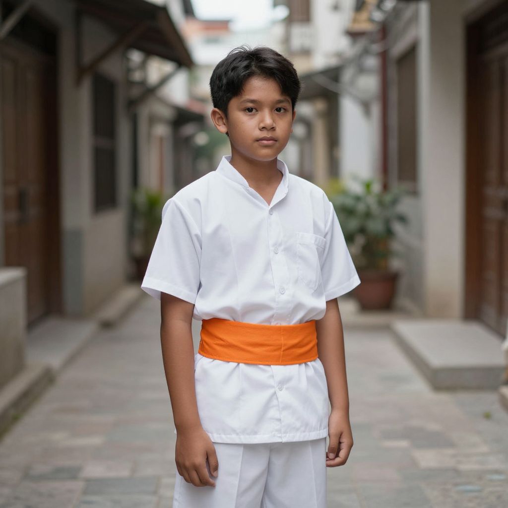Photograph of a young Asian boy standing in a narrow, urban alleyway. He has short black hair, medium brown skin, and a serious expression. He wears a crisp white short-sleeved shirt with a bright orange waistband, and white pants. The alleyway features blurred buildings with dark wooden doors and windows on both sides, and a potted plant in the background. The ground is tiled with a mix of gray and beige tiles. The lighting is natural, suggesting daytime. The boy is centered in the frame, with the alleyway extending into the background.