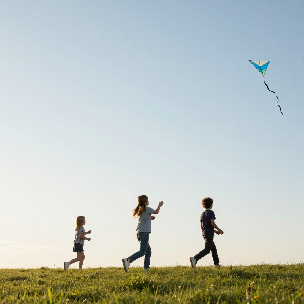 Children fly kites that are future memories, each pulled by invisible gravities toward moments that have not yet happened.