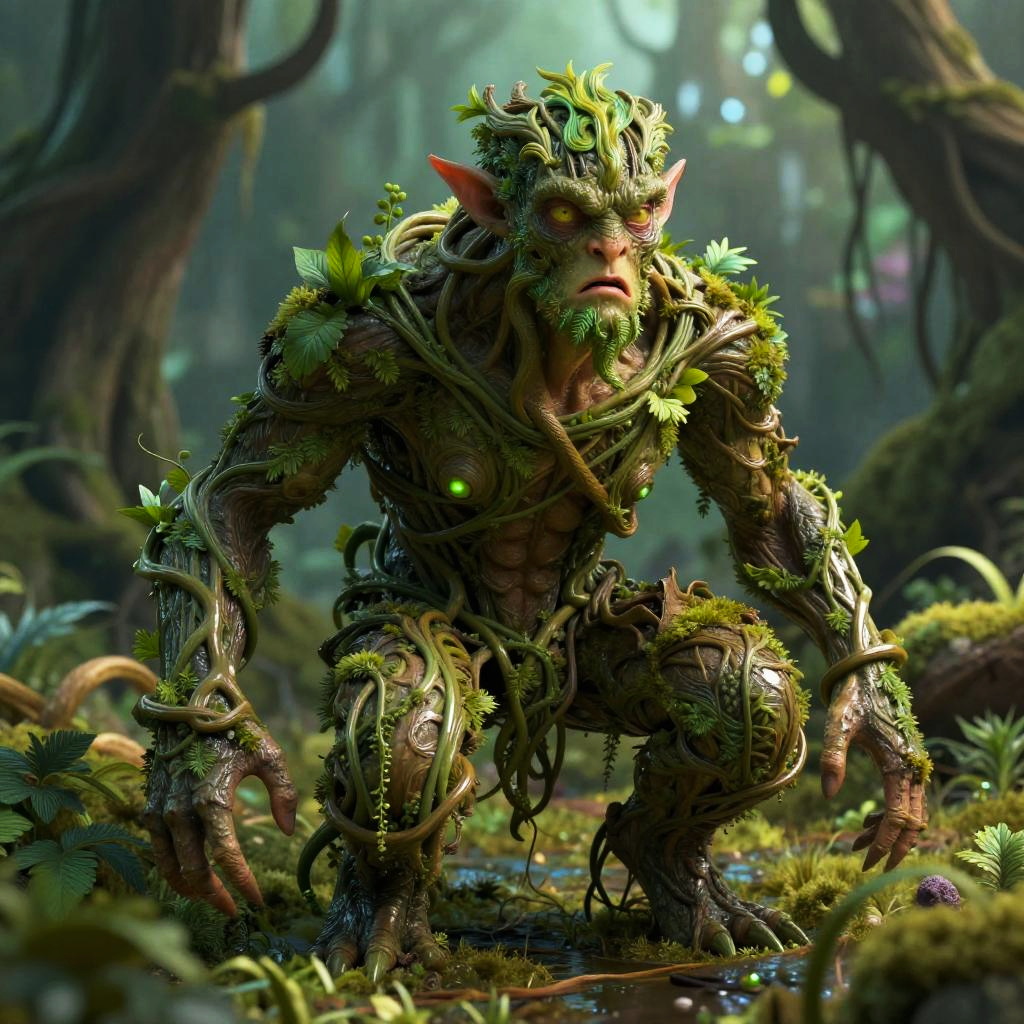 Cinematic still 3D CGI octane rendering of an elemental ent creature made entirely of foliage flora green vines moss and tree roots with a look of concern in a magical swamp ruins, elemental, ent, vines, roots, glowing eyes, close up, eldritch, old (man:0.5), shiny intricate details, sharp, 3D rendering, cinematic lighting, unreal engine, blender
