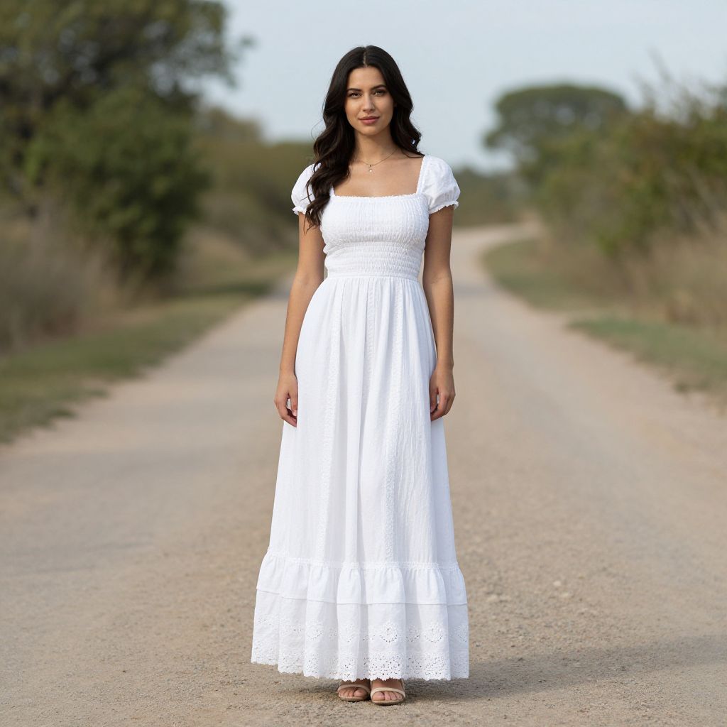 Photograph of a young woman standing on a dirt path in a rural setting. She has long, wavy, black hair and wears a white, short-sleeved, square-neck dress with a pleated skirt and lace detailing. Her skin is light brown, and she has a serious expression. The background shows a blurred, grassy landscape with trees on either side. The path stretches into the distance, and the sky is clear and blue. She stands centered in the frame, with her arms relaxed at her sides and wearing brown sandals.