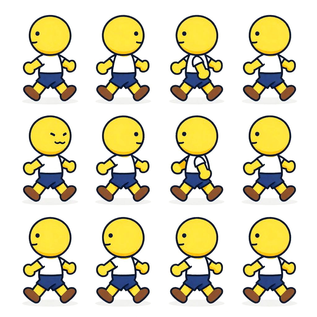 Walking animation sheet featuring a cartoon character in different dynamic walking poses, vibrant colors, clean lines, pixel art style, suitable for game development, 8 frames