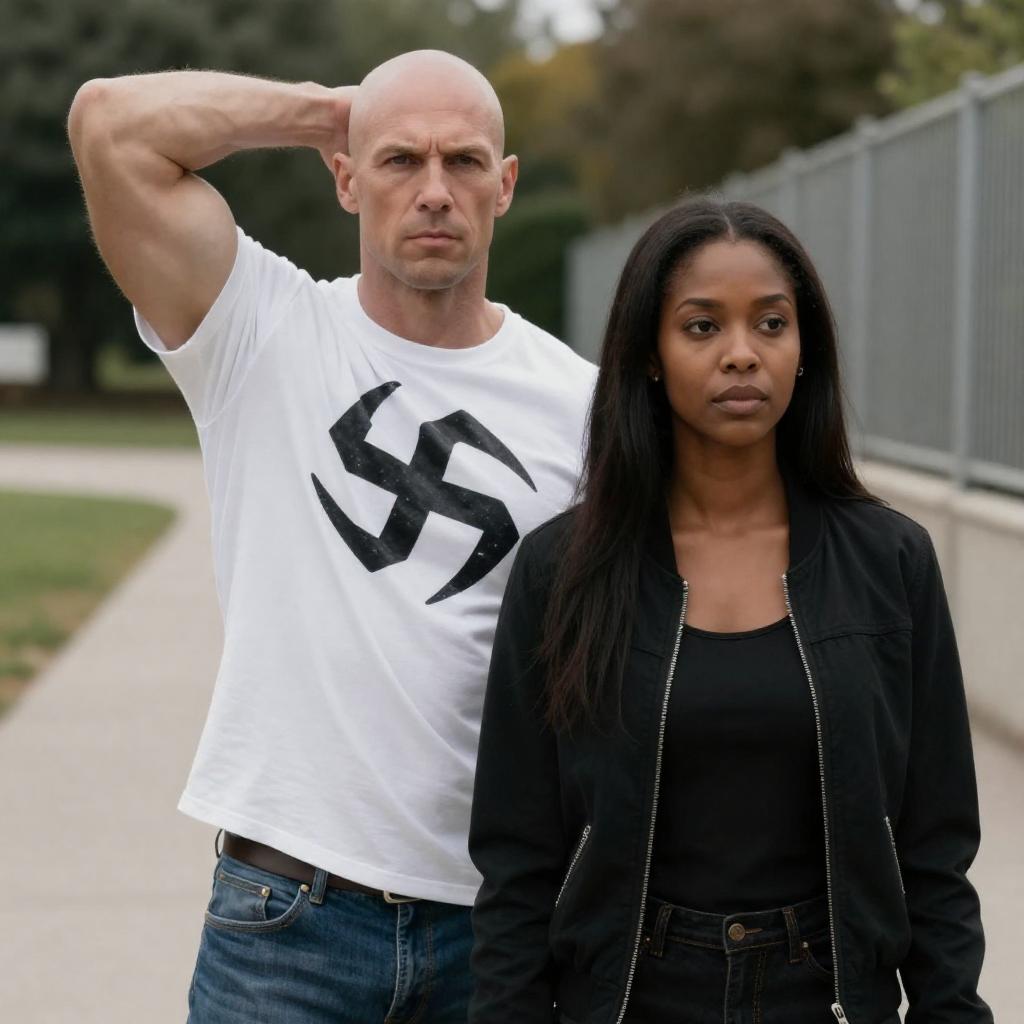 Photograph of two people standing outdoors on a concrete path. Black woman with long hair in black jacket looks to the right. Bald white man with muscular build, wearing white t-shirt with Nazi symbol, raises right hand behind head. Fence and greenery in background. Man has intense gaze.