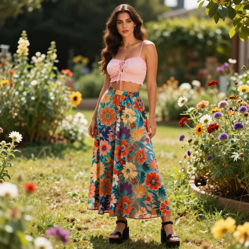 A busty woman in a boho chic outfit featuring a pale pink crop top and a multicolor floral print maxi skirt, stands in a flower garden in a sunlit meadow, embodying the vibrant visual style of Shogakukan. She wears black platform sandals with ankle straps and a simple necklace. Sexy. Pretty face and beutiful eyes