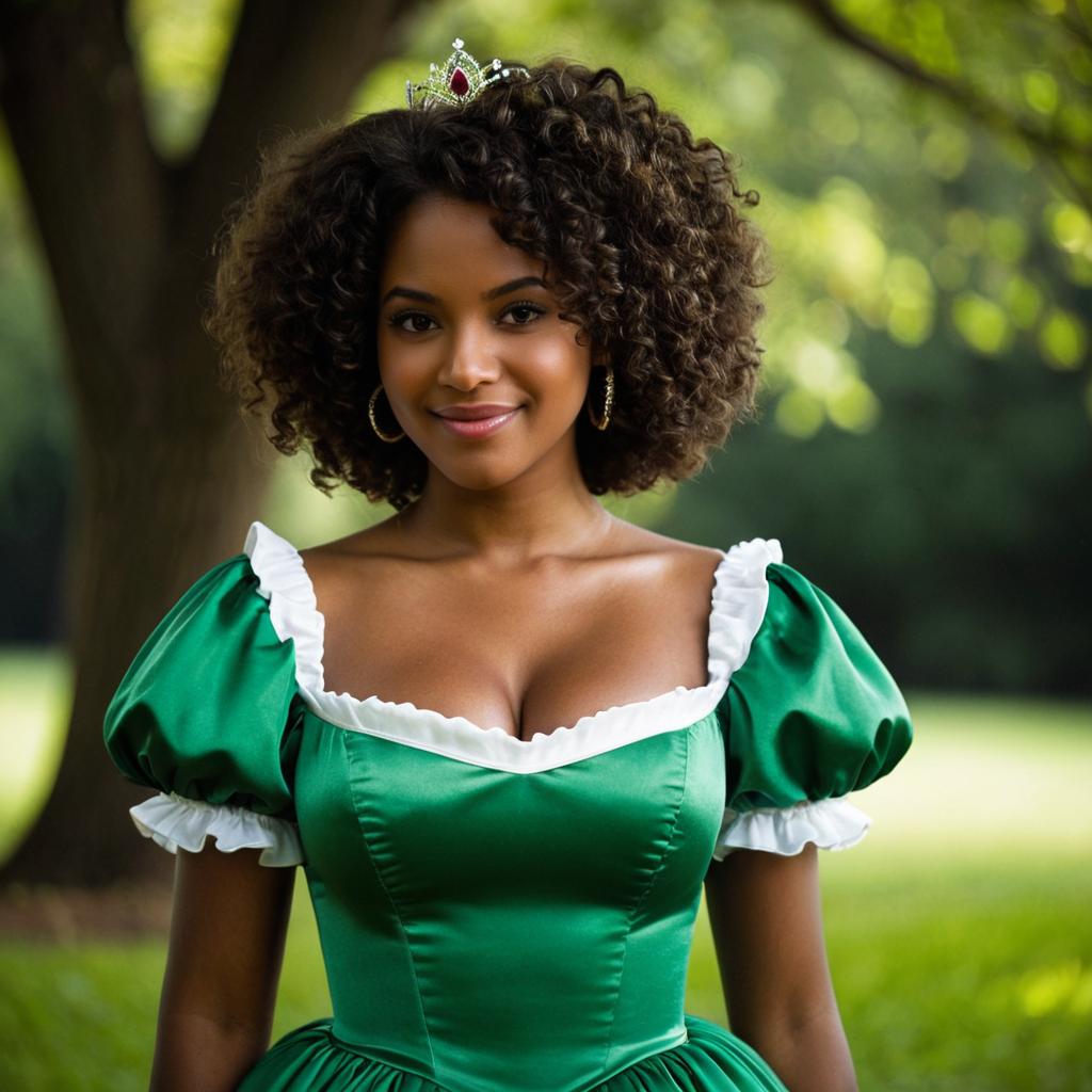 Wanda costume,1girl, solo, dress, curly hair, tree, dark skin, bare shoulders, outdoors, off shoulder, dark-skinned female, green dress, brown eyes, looking at viewer, off-shoulder dress, brown hair, breasts, flower, standing