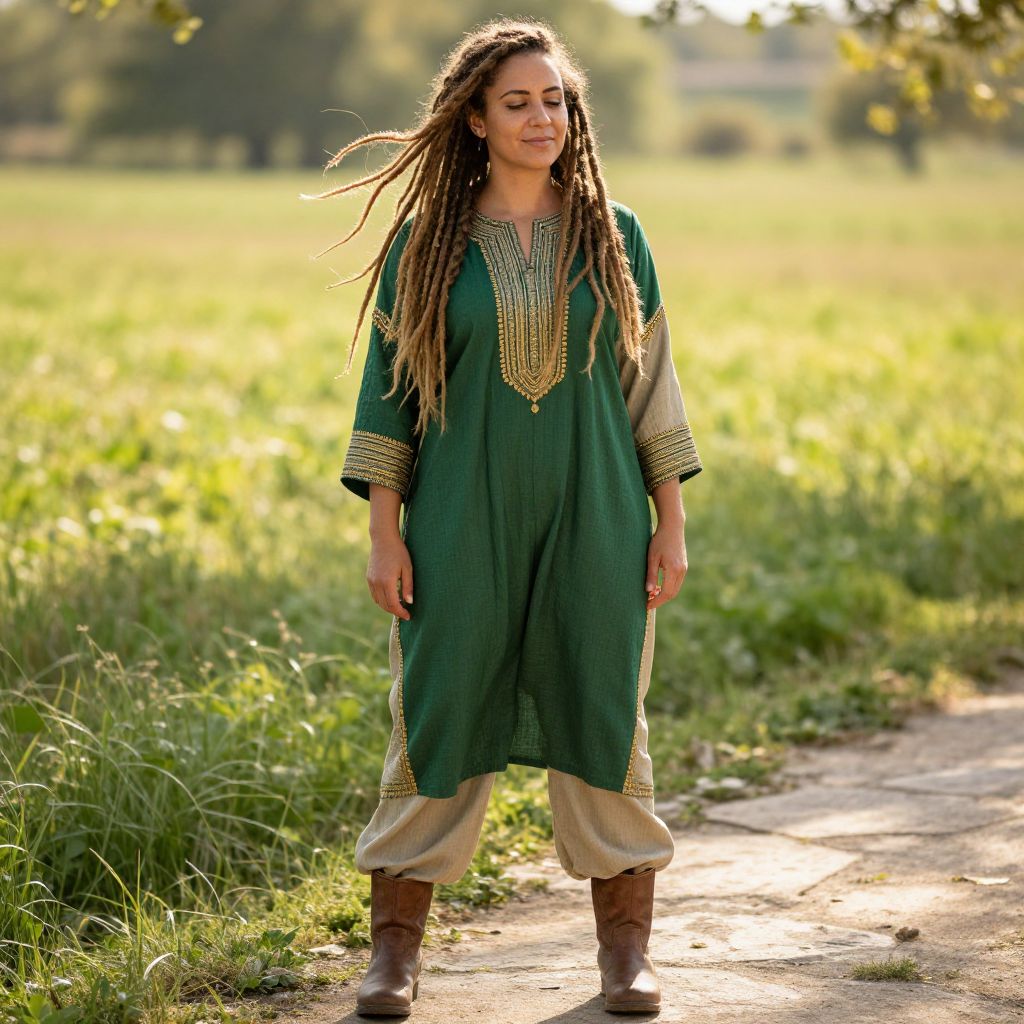 A confident woman with vibrant, flowing dreadlocks, her hair catching the sunlight and adding a dynamic texture to her powerful presence, wearing a stylish green and beige outfit featuring intricate gold accents on the sleeves and neckline—each detail crafted to blend elegance with strength. She stands in a sun-drenched outdoor setting, perhaps at the edge of a lush meadow or near a stone pathway, her expression warm and serene, radiating inner peace and quiet confidence. Her sturdy brown boots anchor her in the moment, emphasizing both groundedness and resilience. The natural lighting is soft and golden, enhancing the rich tones of her clothing and the subtle sheen of her hair, creating a balanced, harmonious scene that celebrates strength, beauty, and authenticity.