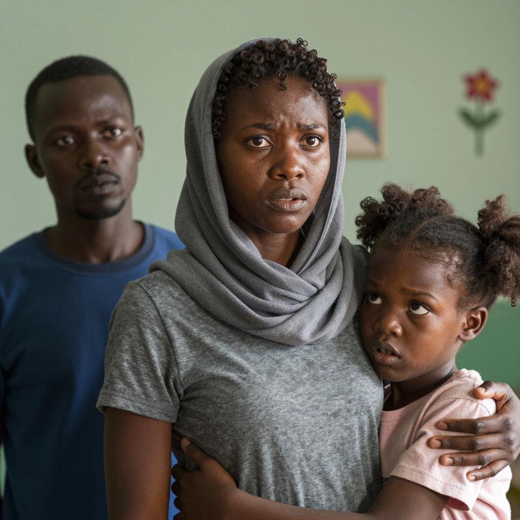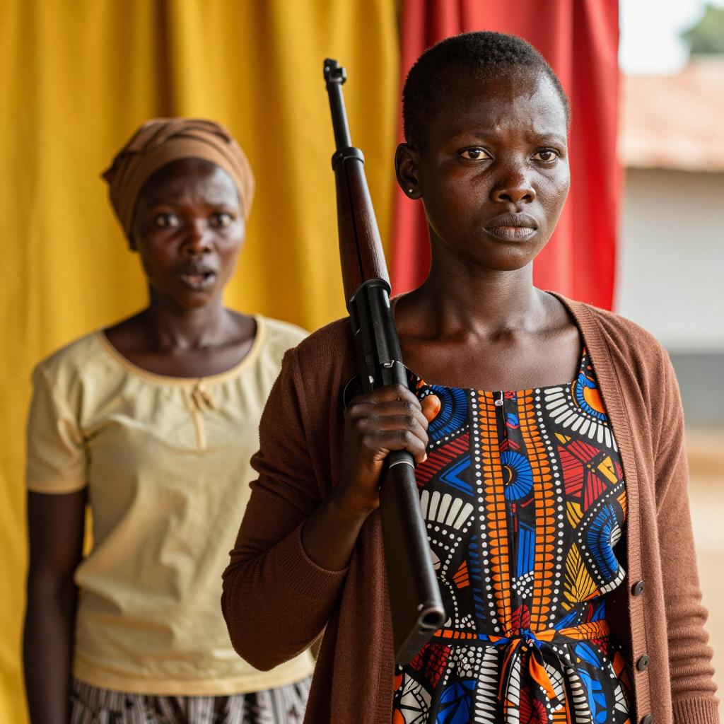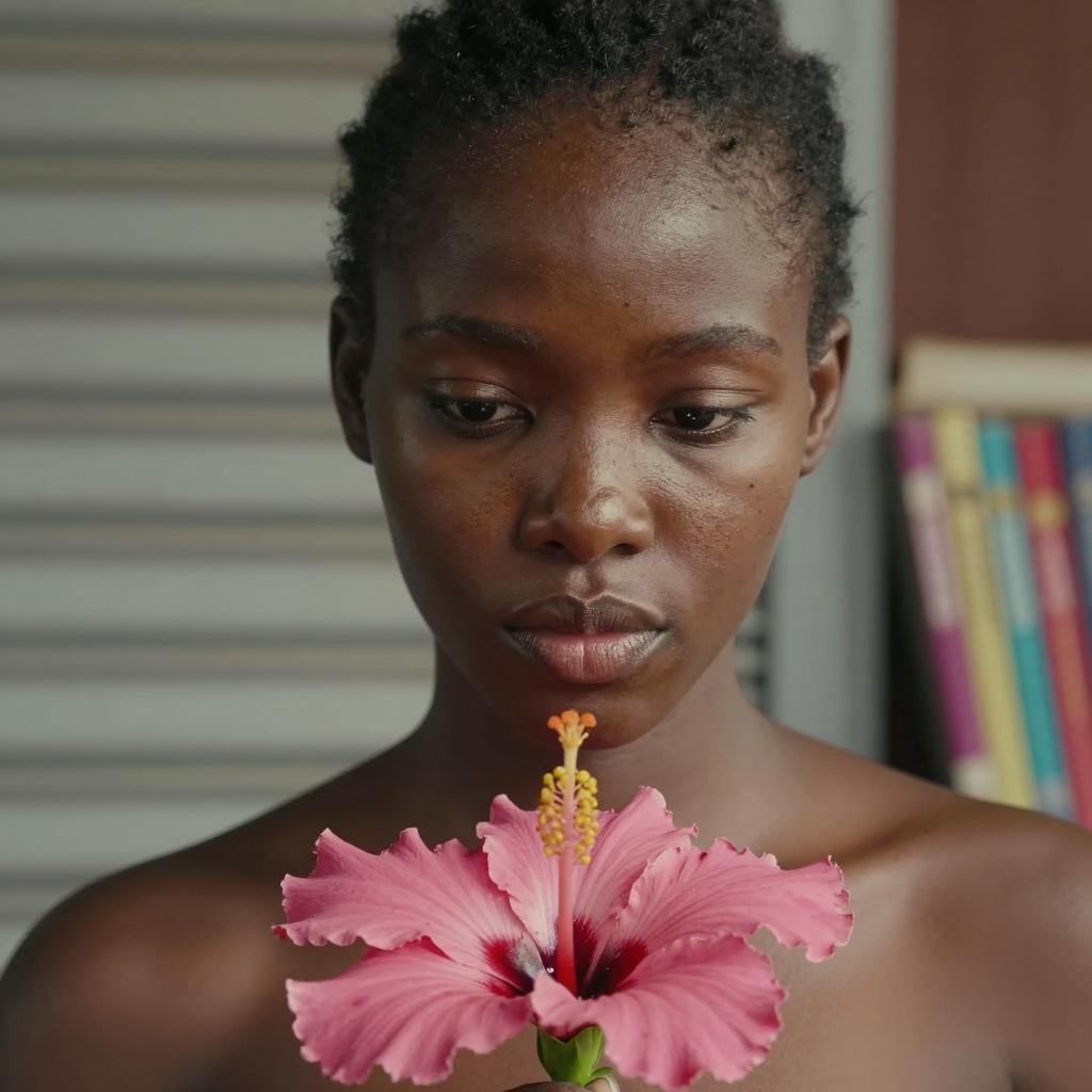 Photograph of a woman with a shaved head, brown skin, and intense expression. She wears a brown shirt and a silver necklace. Dark green blurred background with a shadowy figure behind her. She is centered, facing the camera.