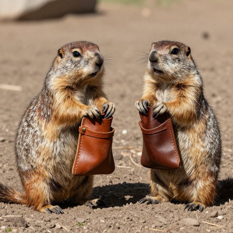 Photograph of two ground squirrels standing on their hind legs on a dirt ground, both holding small brown leather pouches in their front paws. The squirrels have brown and gray fur with white patches, black eyes, and small, rounded ears. They are positioned facing each other, with a blurred background that includes a large rock and some greenery. The sunlight casts shadows, highlighting the texture of their fur and the leather pouches. The image has a bright, natural light setting, emphasizing the colors and details of the squirrels and their surroundings.