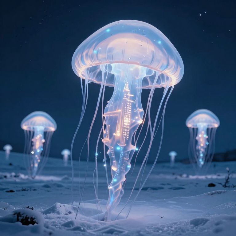Giant translucent jellyfish-like structures hover gracefully above a vast, snow-covered tundra, their pulsating bodies illuminated by bioluminescent light, revealing intricate silhouettes of ancient, cross-topped cities suspended within their ethereal forms.