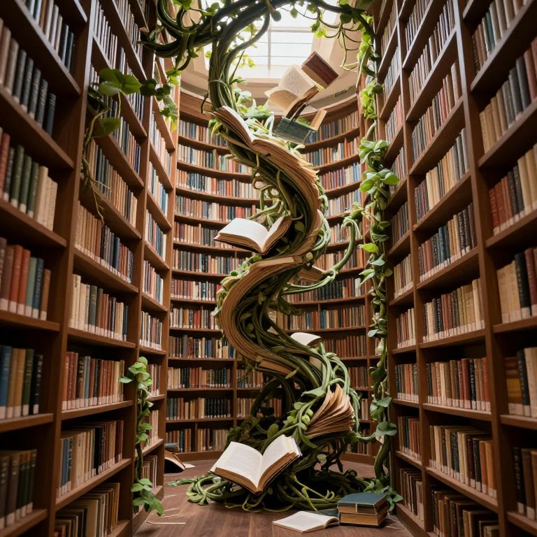 Photograph of a grand, wooden library with towering shelves filled with books on all sides. At the center, an intricately twisted, vine-like structure made of dark, swirling wood and green vines rises from the floor, holding multiple open books. Sunlight filters through the high, glass ceiling, casting a warm glow. The shelves are uniformly lined with books of various colors and sizes, creating a rich, textured background. The floor is dark wood, adding to the library's elegant, classic atmosphere. The scene is both whimsical and majestic, blending nature with literature.