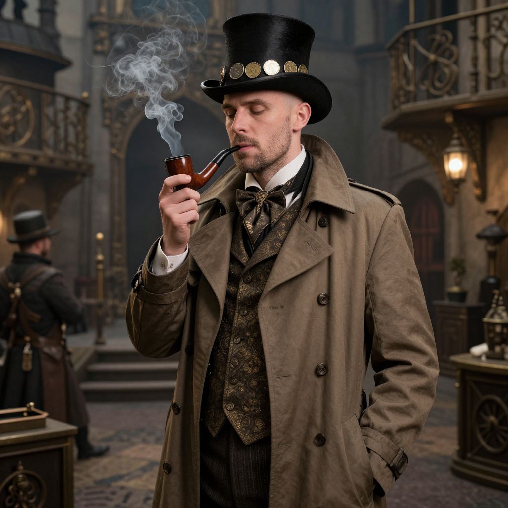 A tall, thin man in his 30s, with light stubble and a bald head, dons a top hat adorned with coins and a long, old trench coat, smoking a wooden pipe in a steampunk fantasy town with intricate details and cinematic lighting.
