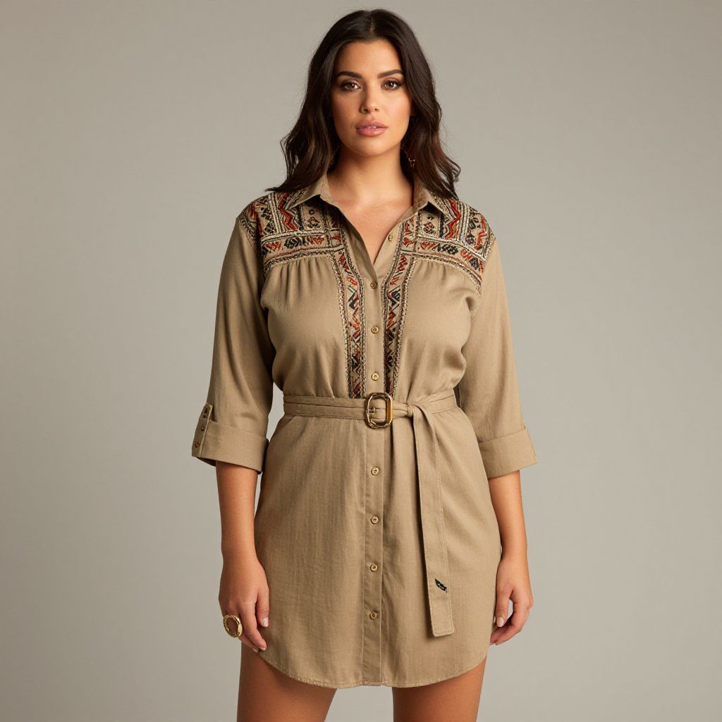"Woman, bohemian, khaki shirt dress with tribal-patterned embroidery detailing on shoulders and front button line, three-quarter sleeves with roll-up button tab, matching fabric belt at waist, knee-length, relaxed fit, button-down front, earth-toned accessories with oversized ring.. Sexy. Pretty face and beаutiful eyes. Big breasts."
