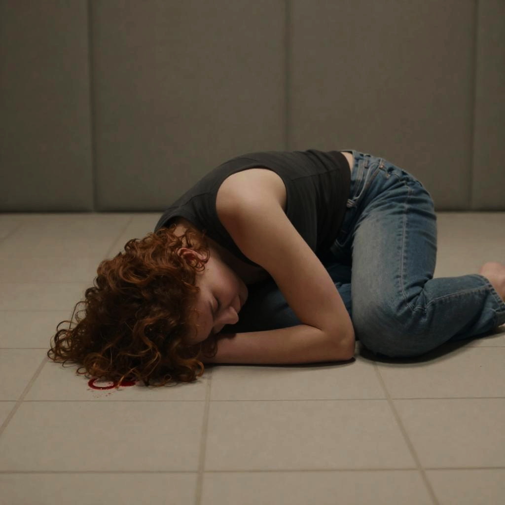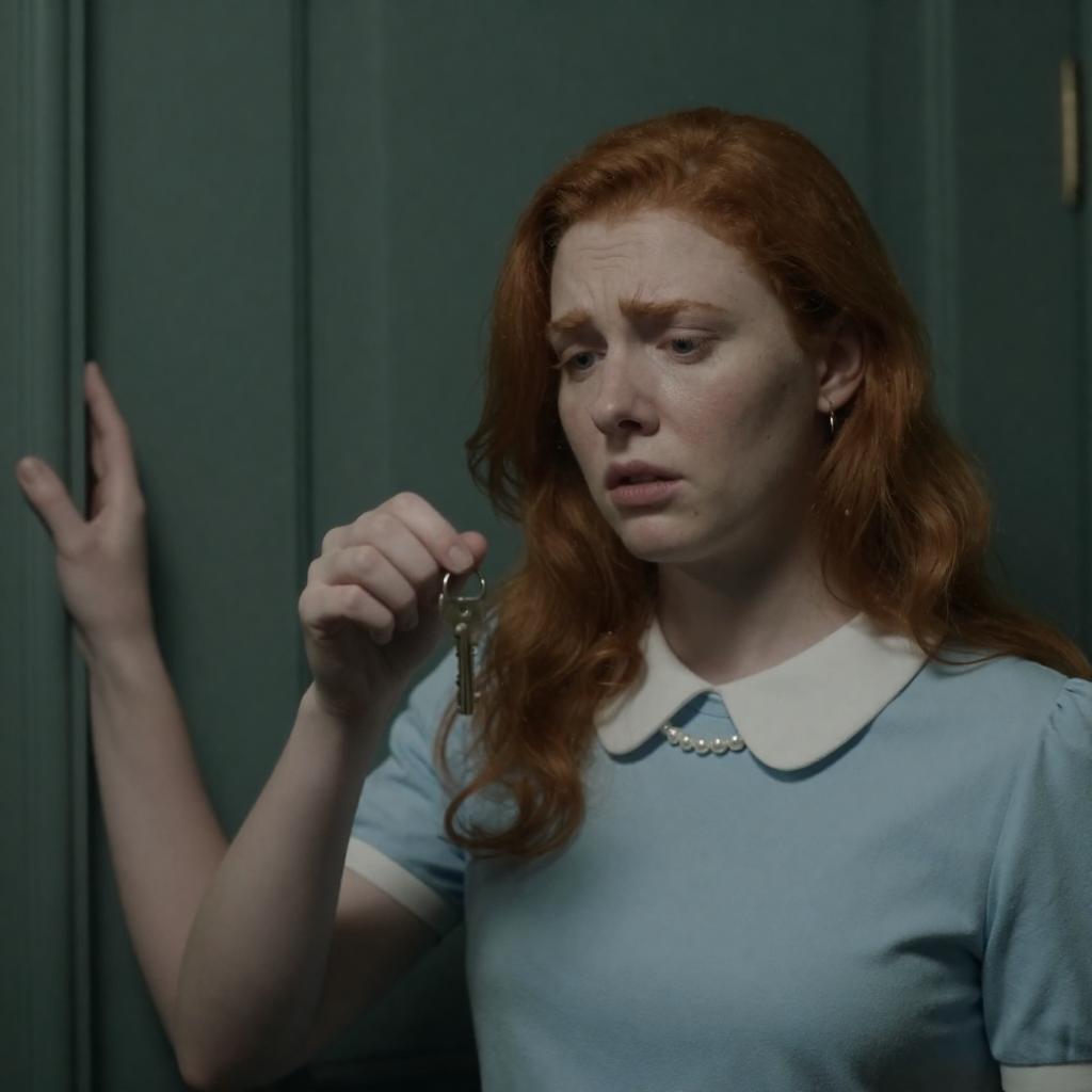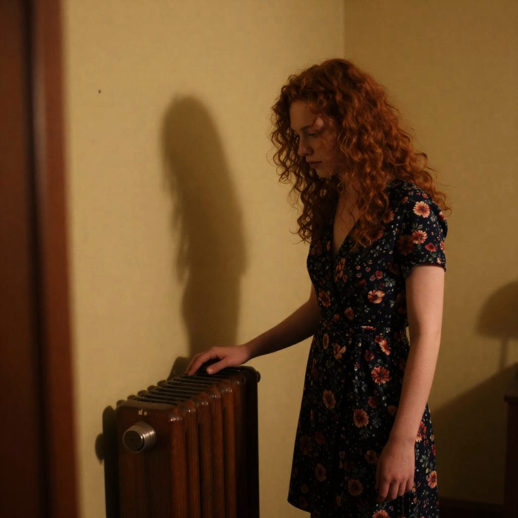 Photograph of a young woman with curly red hair, wearing a floral dress, standing in a dimly lit room, reaching out to a wooden heater. She has a pensive expression. Warm light casts soft shadows on the wall. Partially blurred figure in the foreground. Yellow and beige walls with small dark spots.