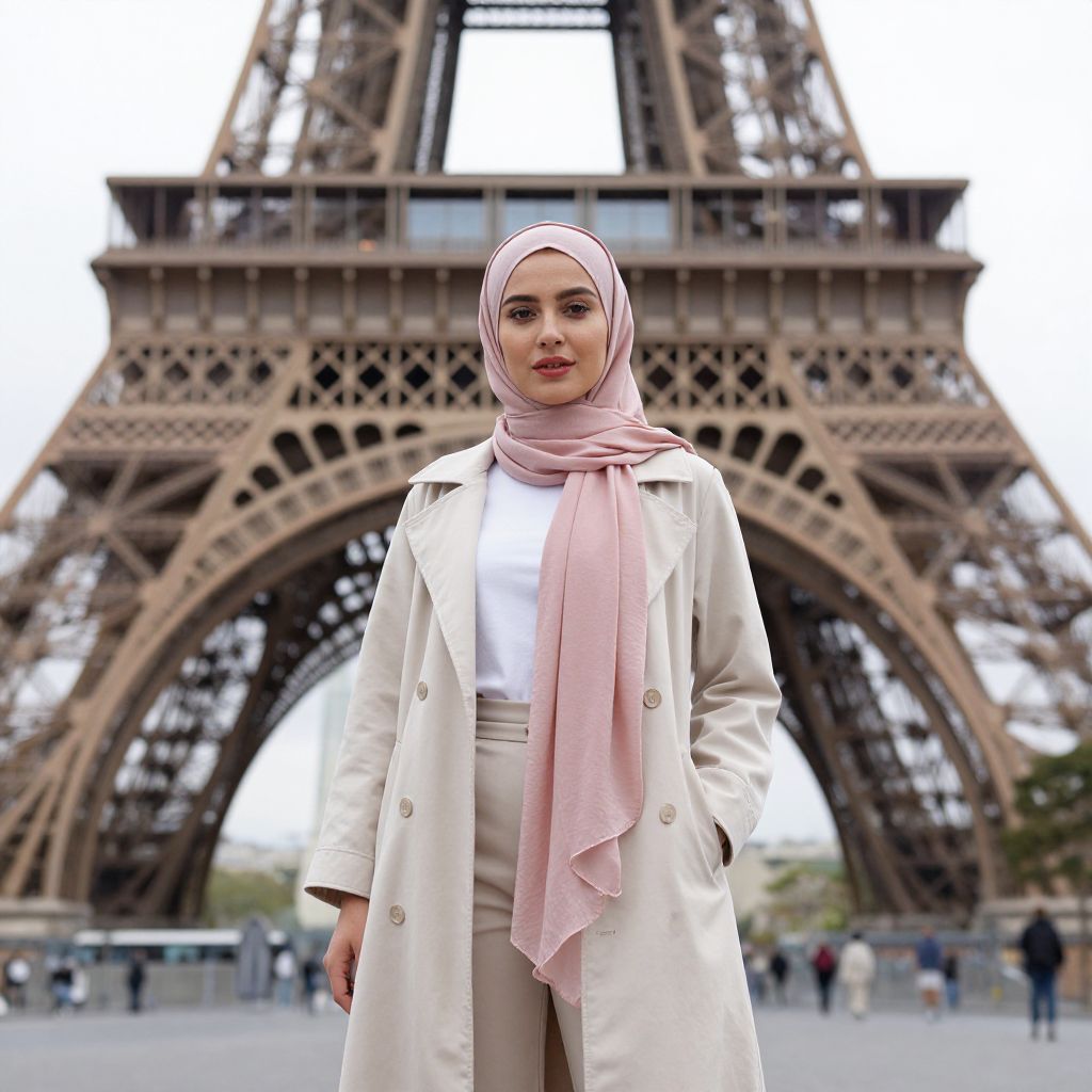 Stylishly dressed woman wearing a pastel hijab and chic French-inspired outfit stands gracefully against the iconic backdrop of the Eiffel Tower, embodying modern Hijabi fashion in Paris.