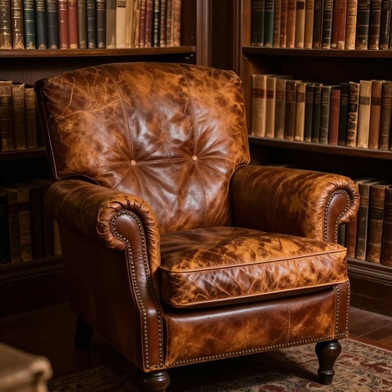 Kastanienbraune vintage leather armchair in an old library, surrounded by shelves filled with ancient books, warm ambient lighting, detailed textures showing worn leather, cozy and inviting environment with a rustic aesthetic.