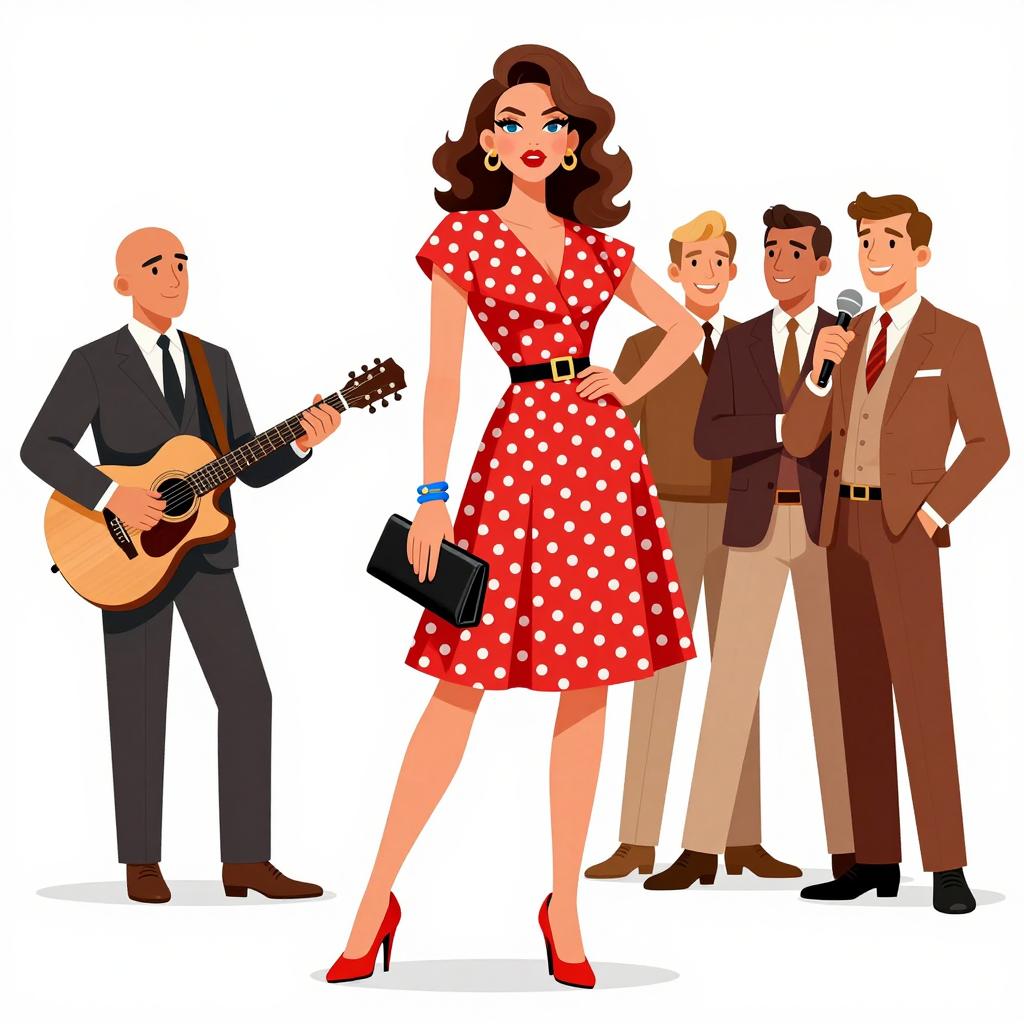 Digital illustration of a stylish woman with curly brown hair, red polka dot dress, red heels, and blue bracelet. She holds a black clutch, striking a confident pose. To her right, four men in 1960s attire: one bald, playing guitar, others smiling, one holding a microphone. White background.