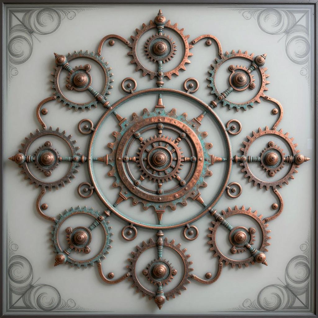 Scrollworks pattern featuring steampunk scrolls entwined with gears and cogs in oxidized copper scrollwork on weathered teal arranged as central circular medallion of scrollwork on a plain field on glass panel with frosted scroll etching rendered as engraving-style black and white etching, ultra-detailed, sharp ornamental design, high resolution, intricate decorative pattern art